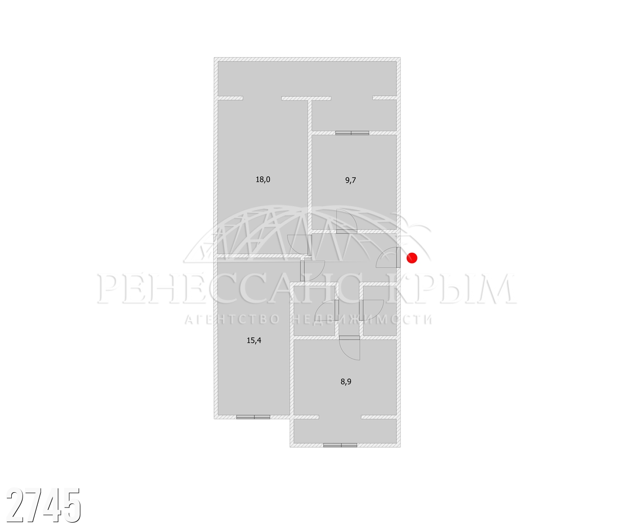 Жилая — 43,1 м² (комнаты 15,4 м² / 18 м² / 9,7 м²)